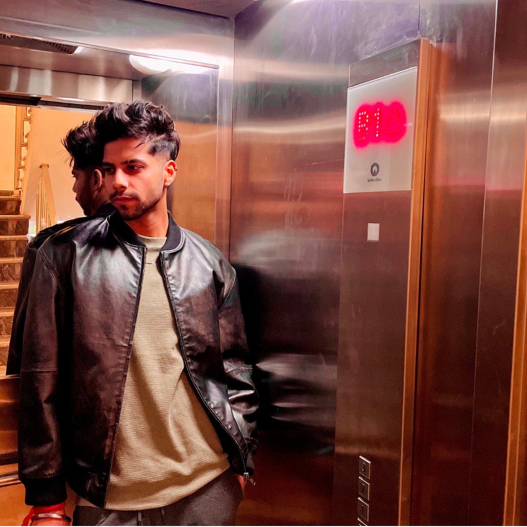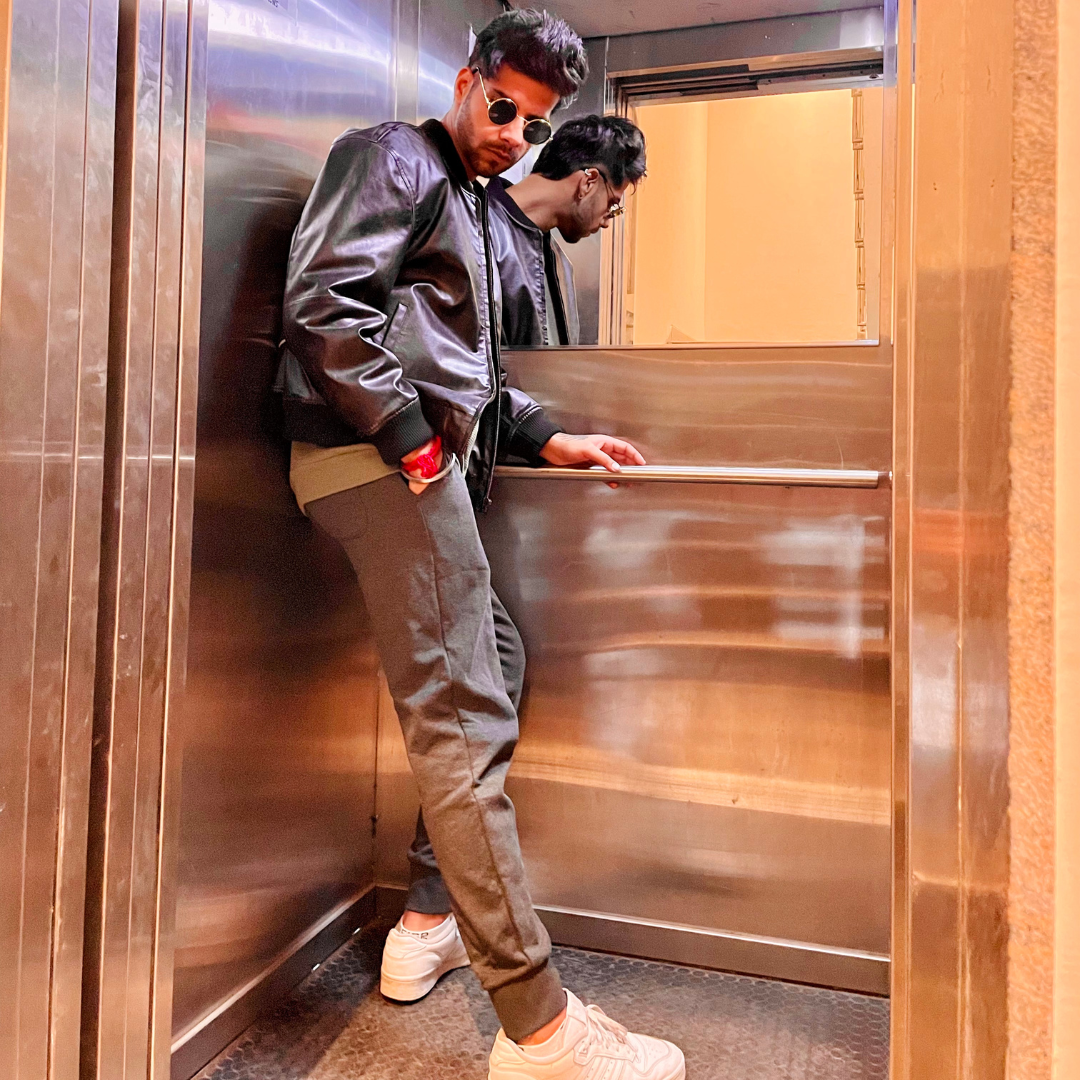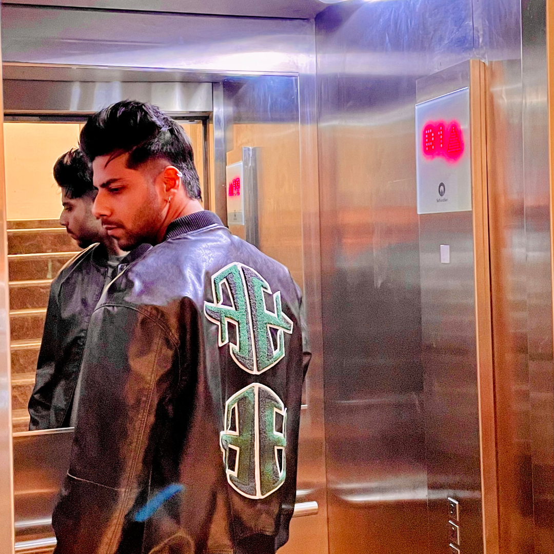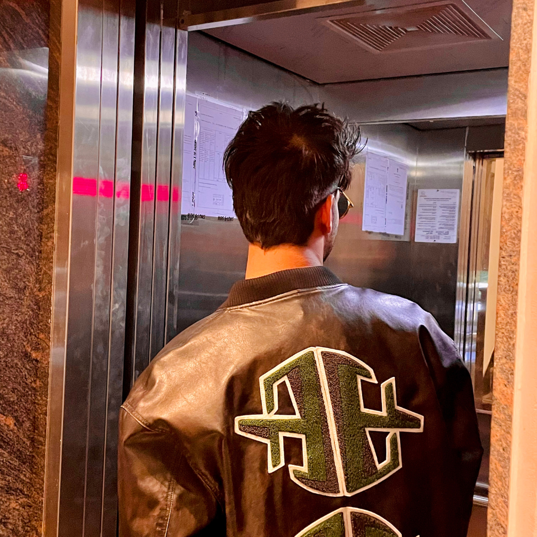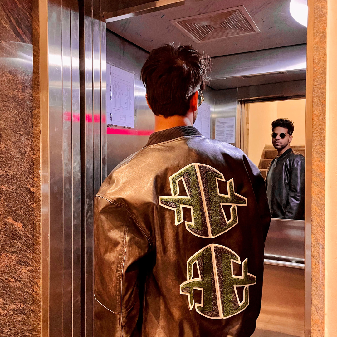 High fashion street Bomber Jacket with 9FIGR logo patchwork in towel embroidery at the back , Distressed vegan leather finish, Oversized fit.