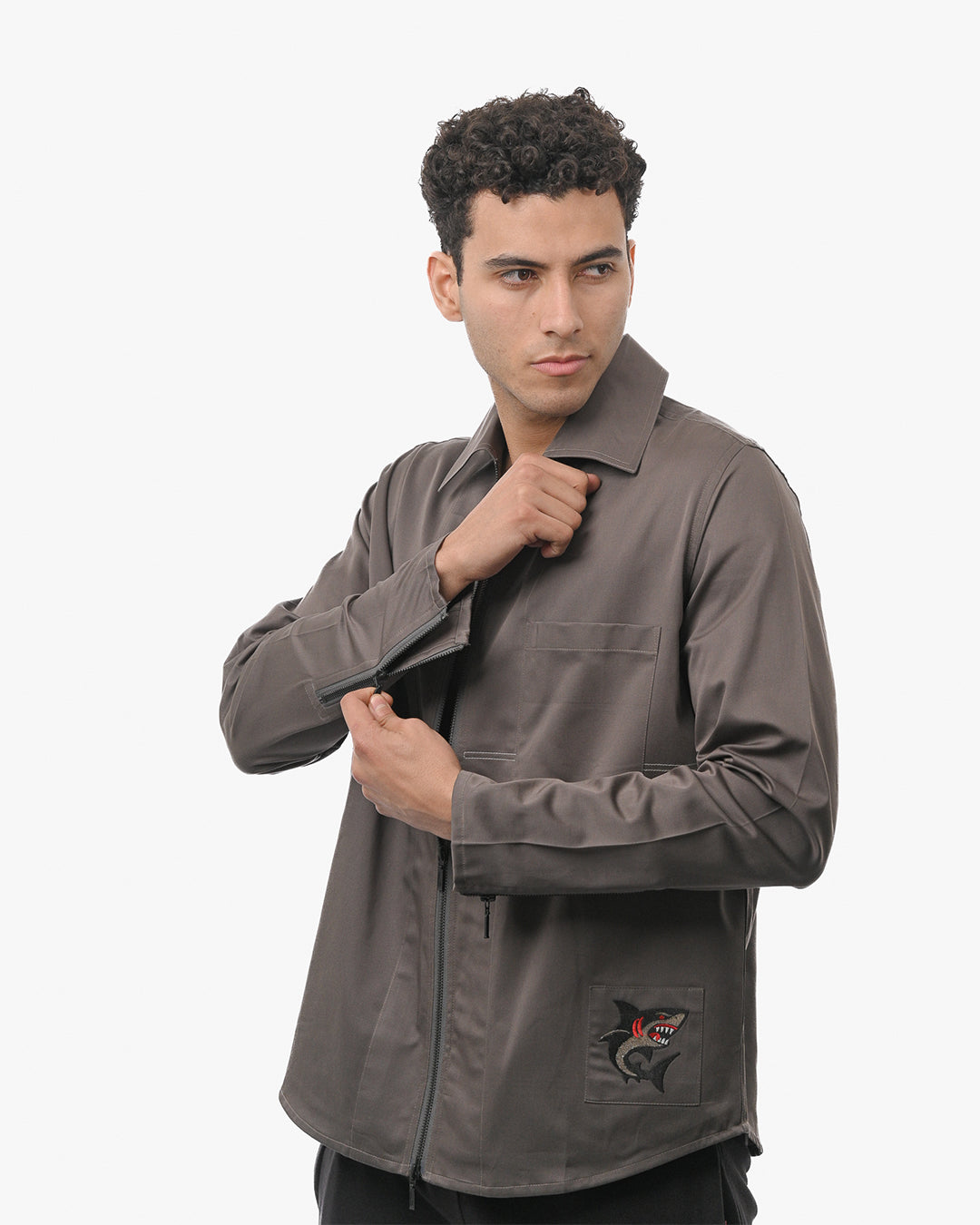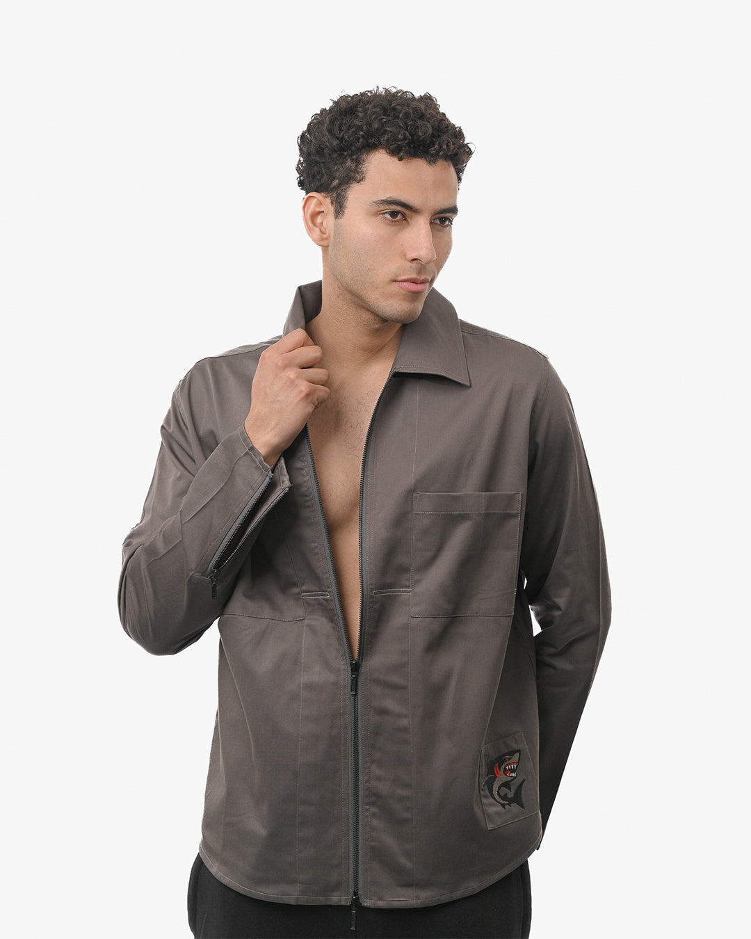 Sharp, versatile, and effortlessly modern this charcoal grey overshirt is designed for elevated everyday wear. Featuring a structured collar and full-length front zip closure, it blends the clean lines of a jacket with the comfort of a shirt.