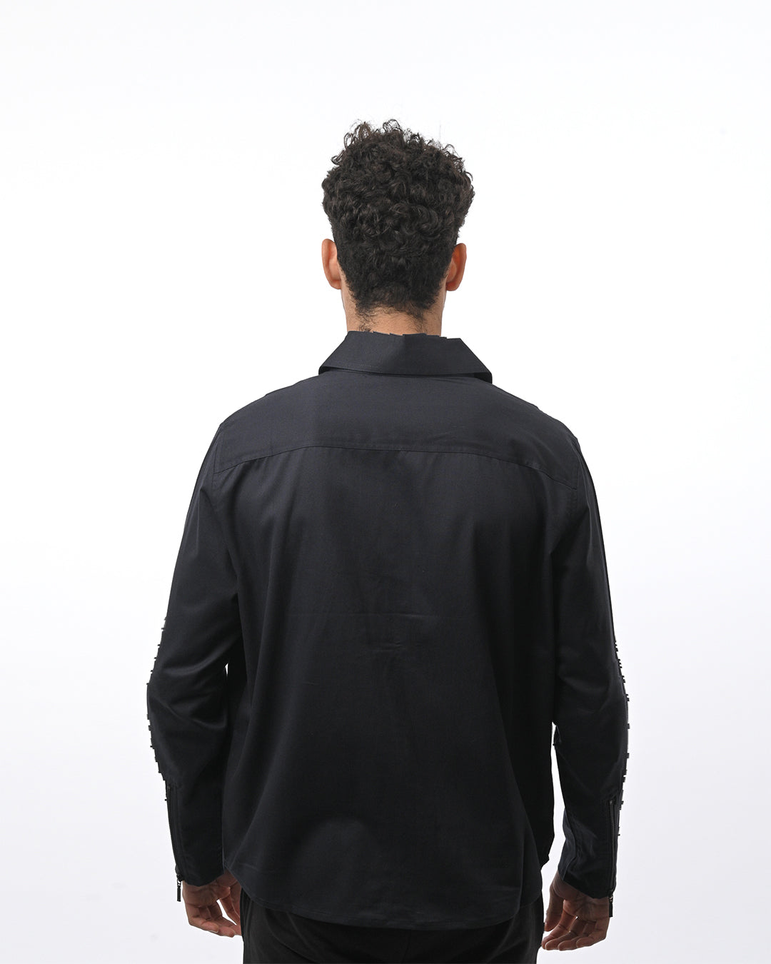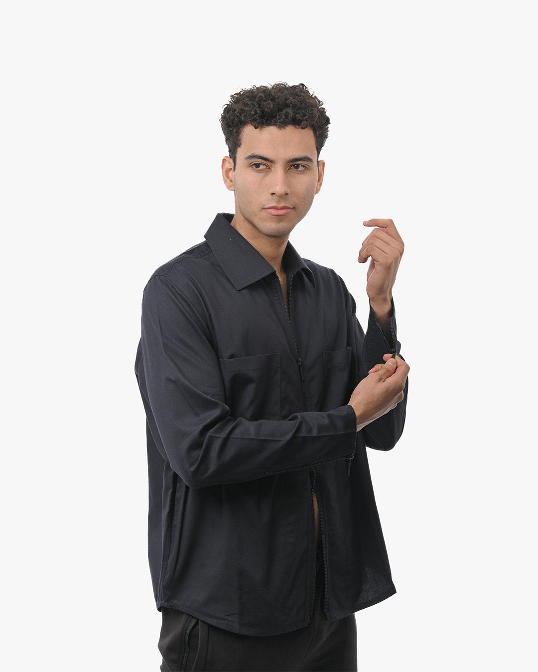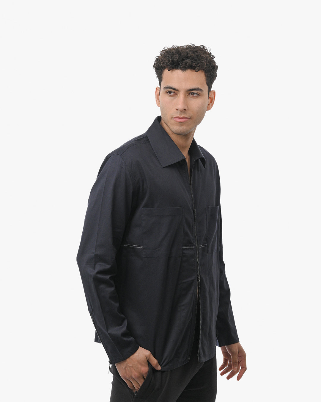 A timeless essential with a distinctive twist, this navy overshirt blends sharp structure with modern minimalism. Designed with a classic collar and full-length front zip closure, it delivers a sleek, versatile silhouette suited for both smart and casual styling.