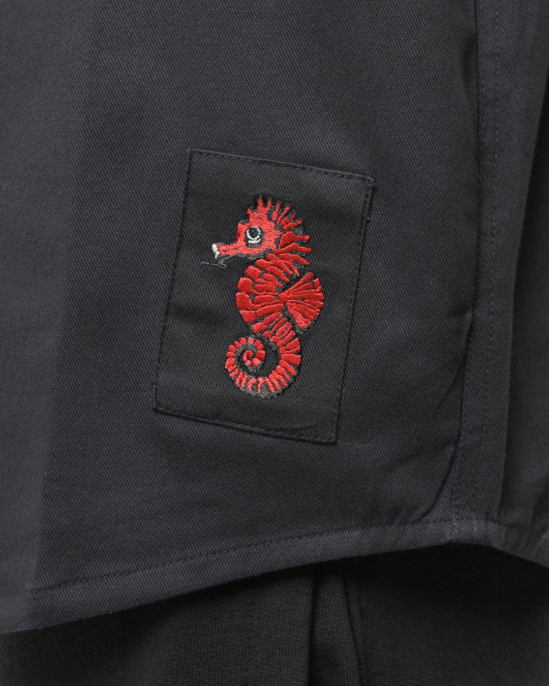 A bold red seahorse embroidery at ther lower hem introduces a signature statement element, giving the piece a refined yet playful edge.