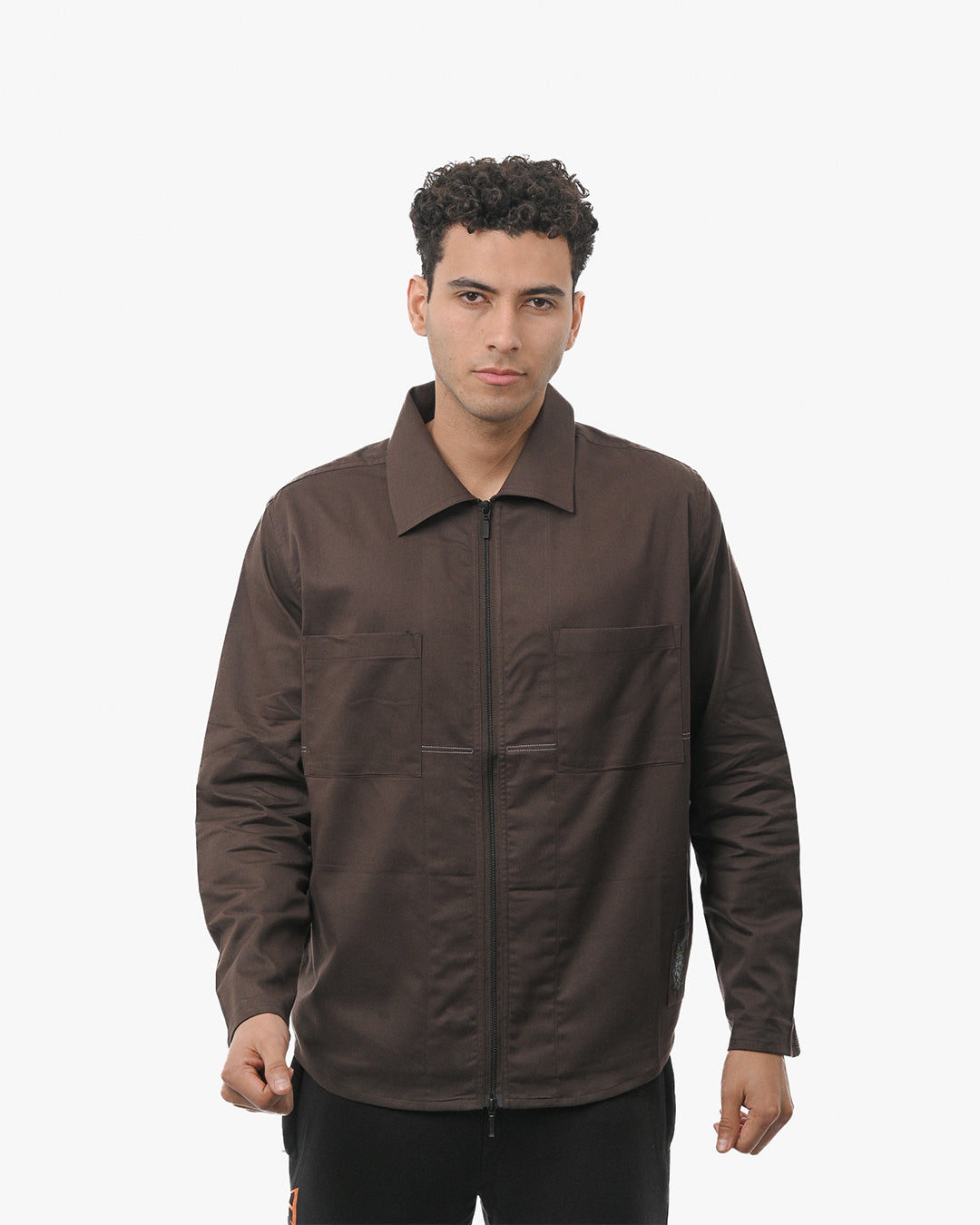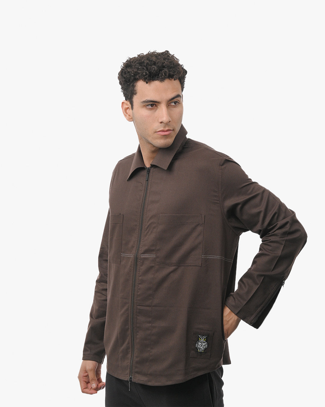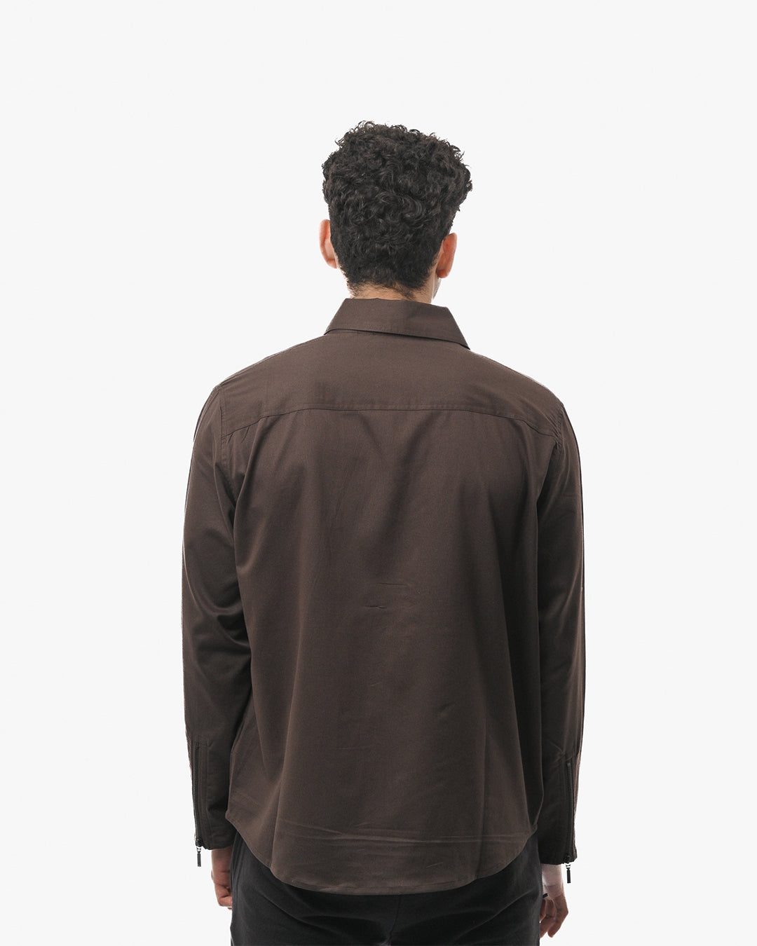 Sophisticated and versatile, this mocha brown overshirt is designed for effortless everyday styling. Featuring a structured collar and full-length metal zip fastening, it delivers a clean, modern silhouette that works as both a shirt and a lightweight jacket.