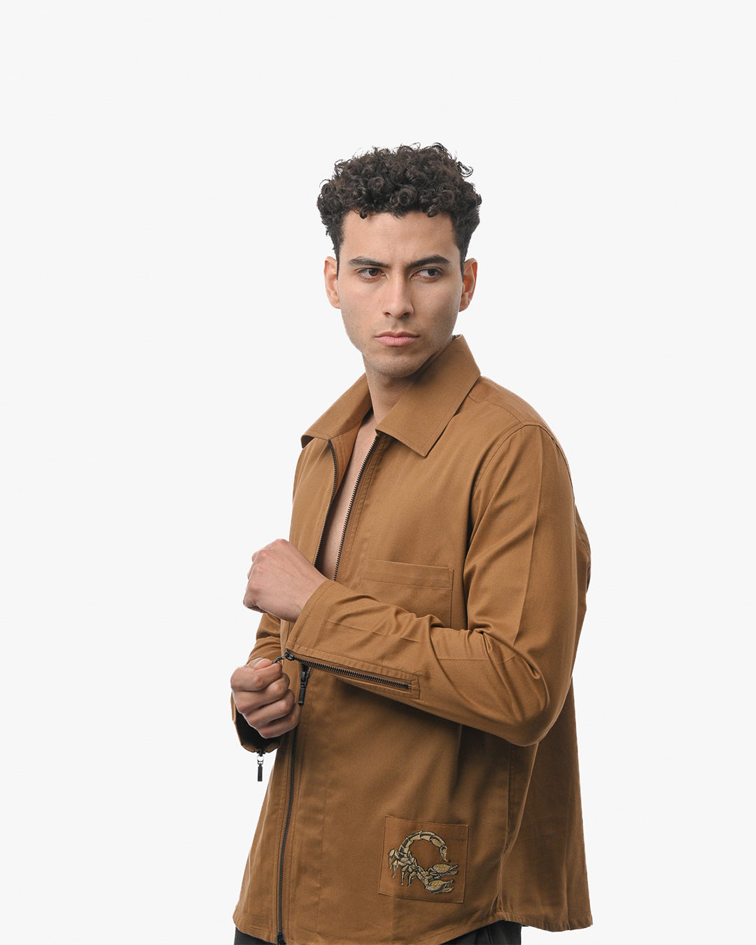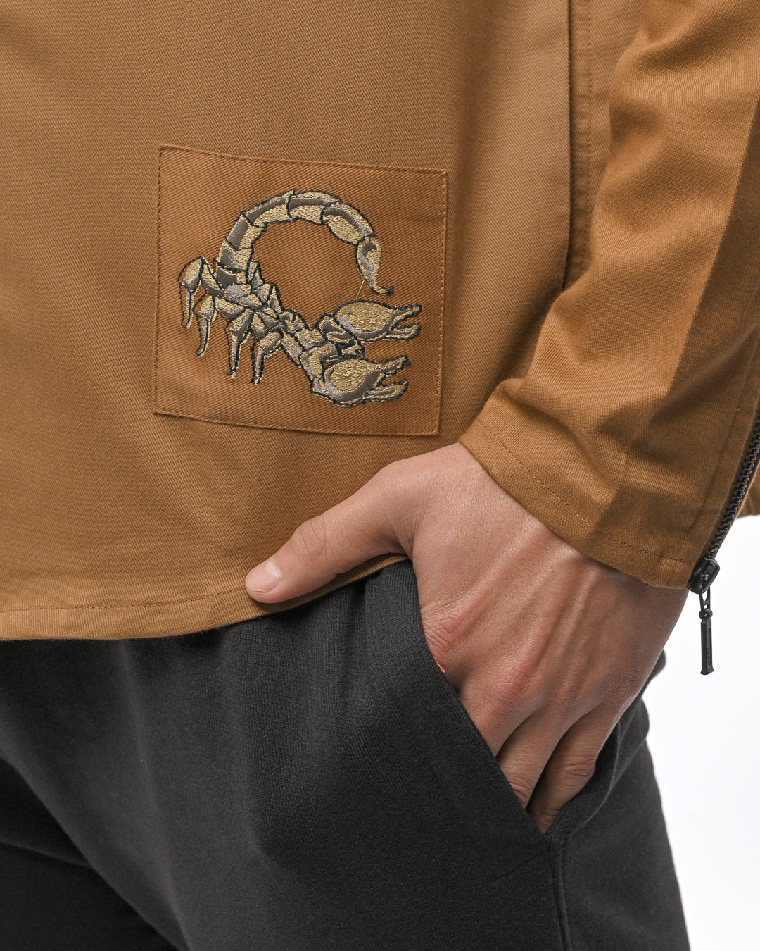 A standout embroidered scorpion patch at the lower hem introduces a powerful signature element, adding character to the warm camel tone.